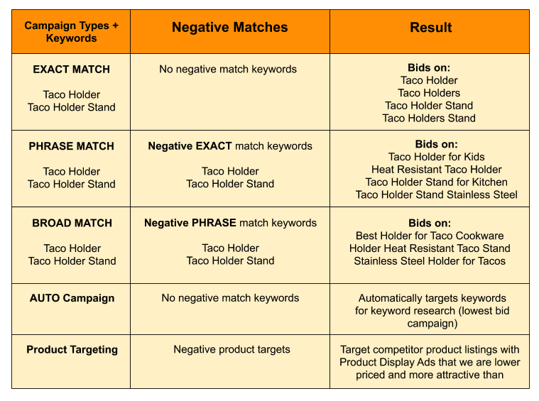 Lastly, you have your broad keywords. These keyword types will take your submitted keyword and search for any keyword format that has the keywords inside, in any order. If you enter Taco Holders, this campaign will find you, Holders for Tacos best, Stainless Steel Holders for Tacos, etc.