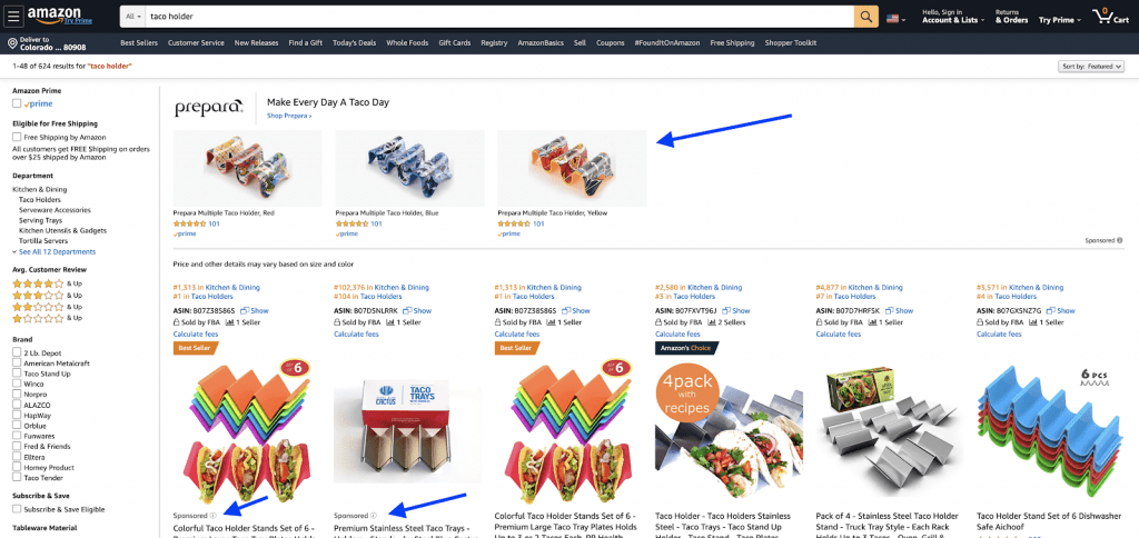 When a customer searches for ‘Taco Holders’ on Amazon, you can pay to show up higher on the page than where your product is organically ranked for that keyword. And people click more on the first 1-8 results than any other place on the results pages.