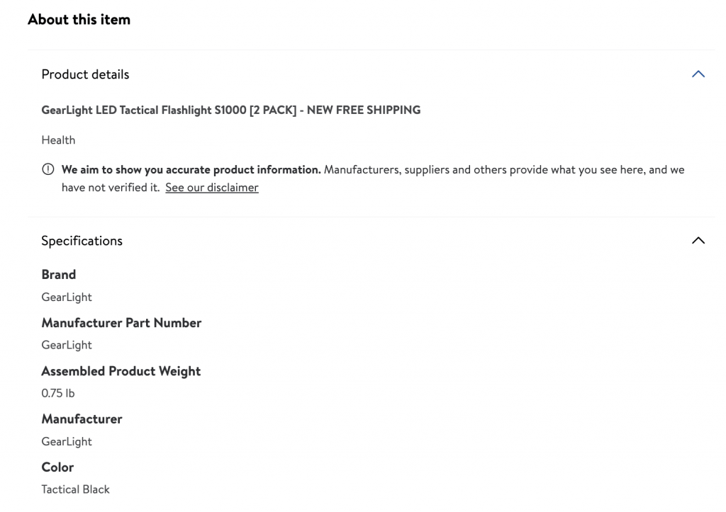 Notice the title length and photos. As well, look at how Amazon lists product details close to the top. But for Walmart, users can scroll down to get more info if they want it, which looks like this: